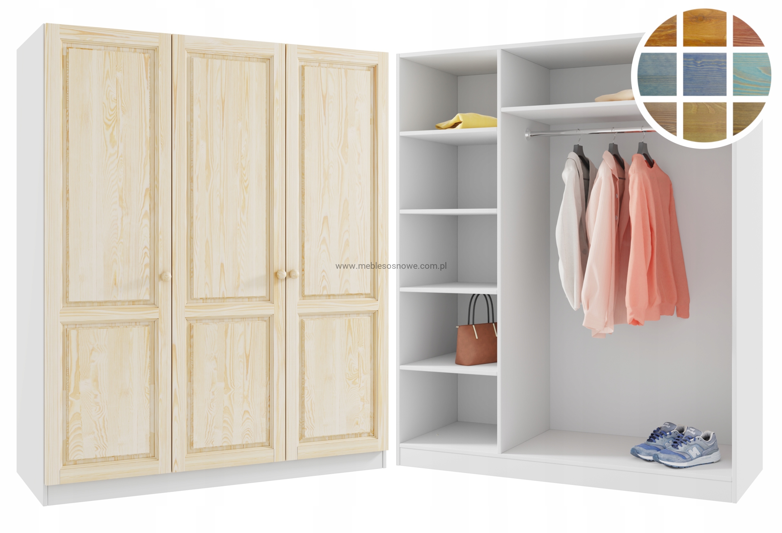 Dzień dobry! Prezentujemy Państwu szafę sosnową PŁYTA LAMINOWANA + DREWNO SOSNOWE BEJCOWANE szer. 150 cm składającą się z :