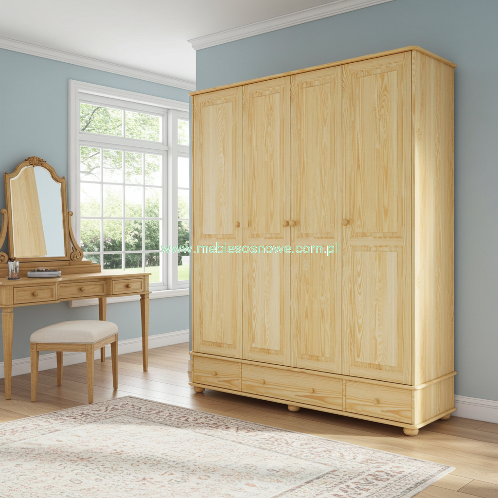 Szafa sosnowa z litego drewna to doskonały wybór do przestronnych pomieszczeń, takich jak sypialnia, garderoba czy pokój nastolatka. Dzięki szerokości 195,5 cm oferuje bardzo dużo miejsca do przechowywania ubrań, dodatków i tekstyliów, zachowując przy tym klasyczny, naturalny styl drewna sosnowego. To praktyczne i pojemne rozwiązanie dla osób ceniących solidne, trwałe meble z naturalnych materiałów.